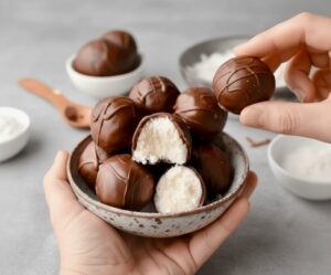 Keto Coconut Truffles are creamy on the inside and coated with a delicate chocolate shell. Each bite melts smoothly and delivers a rich coconut flavor.
